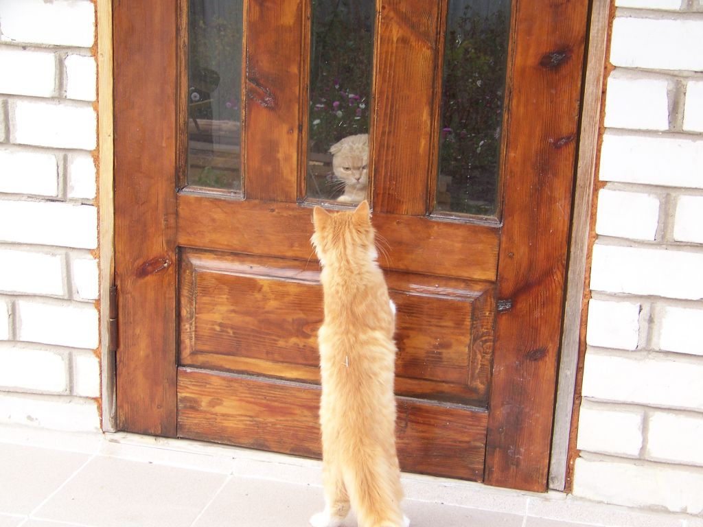 Встреча через стекло. Судя по выражению лица хозяйки – визит явно не вовремя.