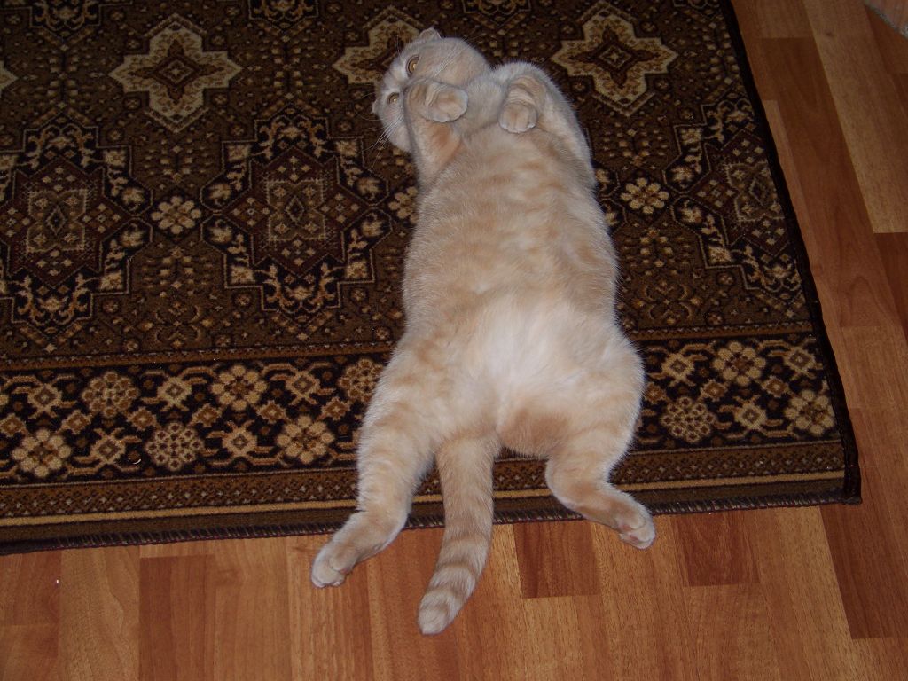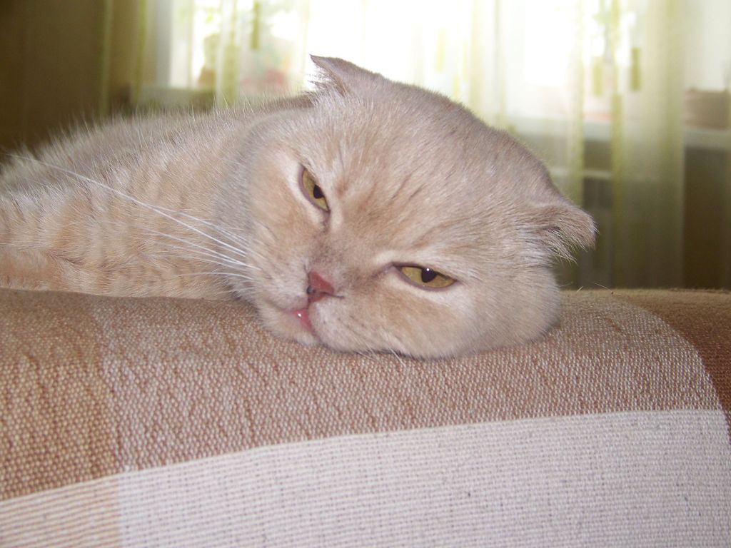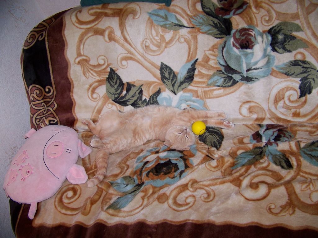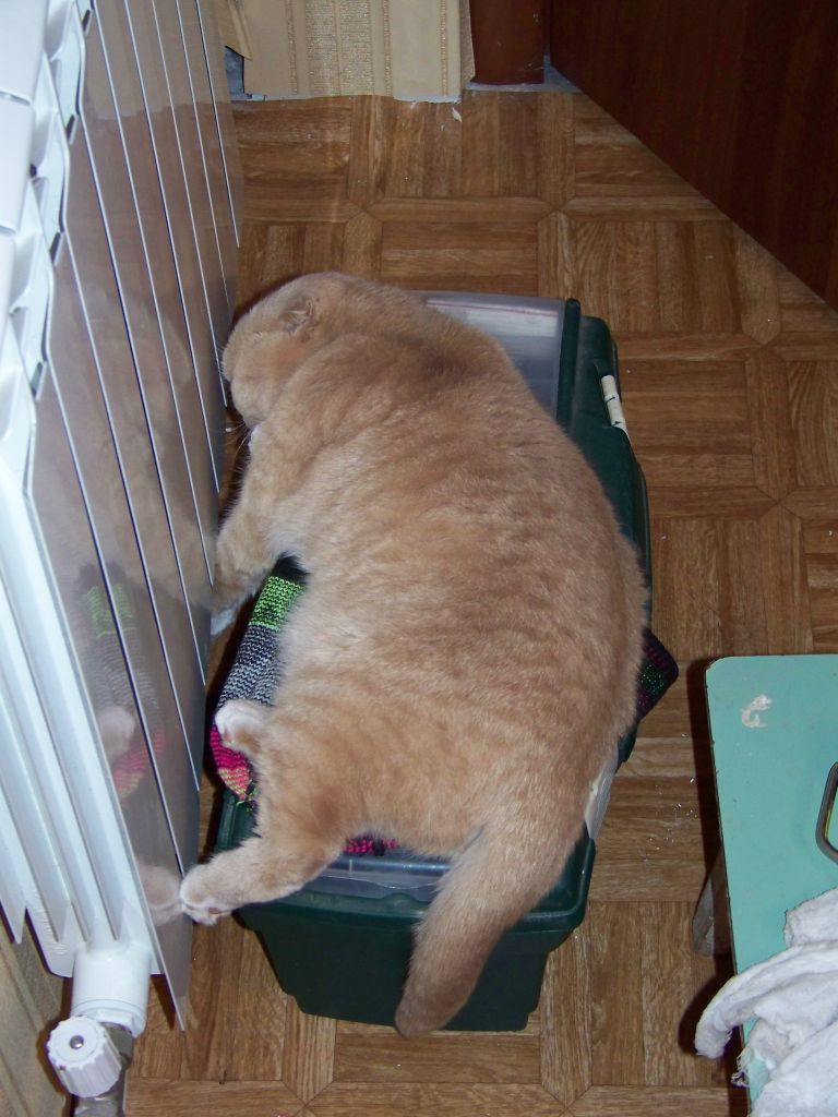 Спит на ящике с инструментами мордой к радиатору. Обожает тепло.