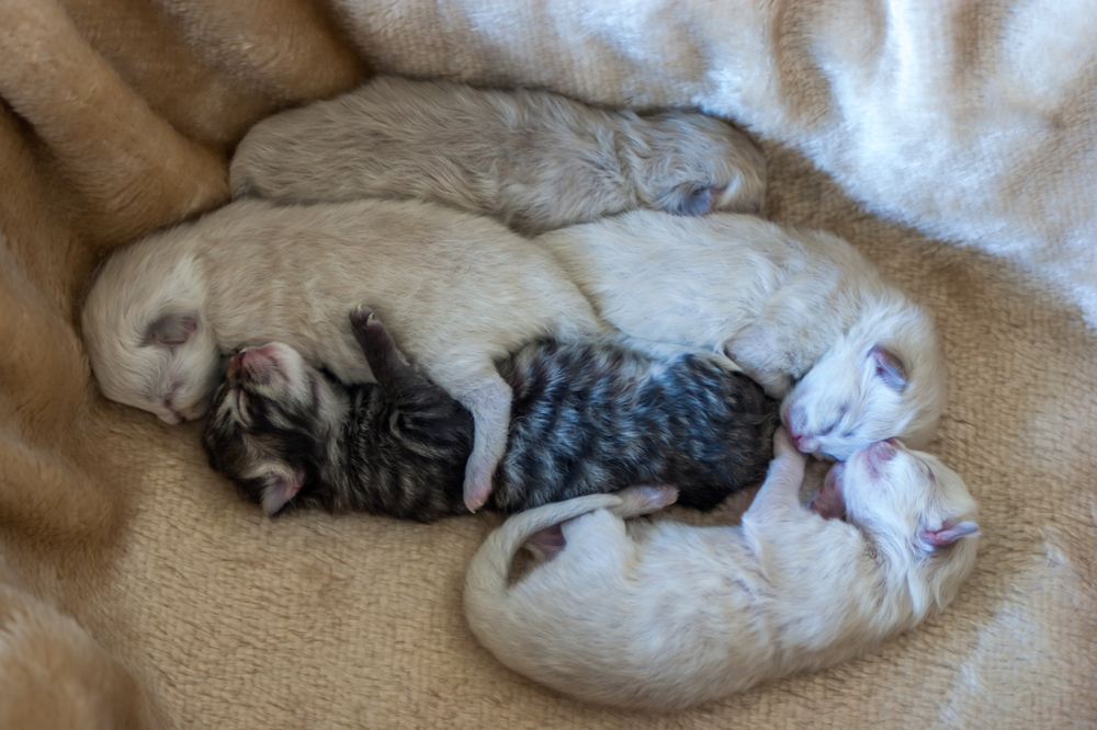 Котята рождаются слепыми, глухими, но с уже развитым обонянием – малыш способен унюхать маму на расстоянии до полуметра. Вес при рождении составляет не больше 100 грамм, длина до 10 см. Шерсть тонкая, слабо развита терморегуляция, поэтому им жизненно необходимо присутствие мамы, которая их будет греть. Костяк хрупкий и котята требуют бережного отношения, лучше их вообще не тискать и не брать на руки.