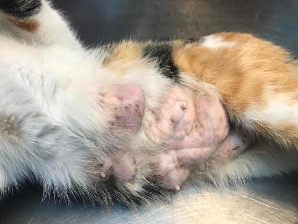 По внешнему виду воспаление схоже с промежностной грыжей у кастрированных котов, только во втором варианте шишка меняет свой размер и очертания в зависимости от горизонтального положения тела в пространстве:
